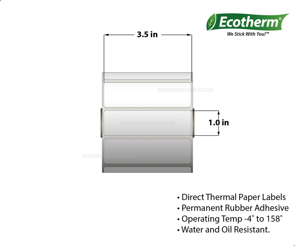 Label Size: 3.50 x 1.00 Inner Core Of Roll: 1" Core Rolls Print Method: Direct Thermal Color: White Material: Paper Perforations: Perforated Adhesive: Rubber Labels Across: 1 Labels Per Roll: 1,340 Rolls Per Case: 4 Labels Per Case: 5,360 Sold By: Sold By The Case