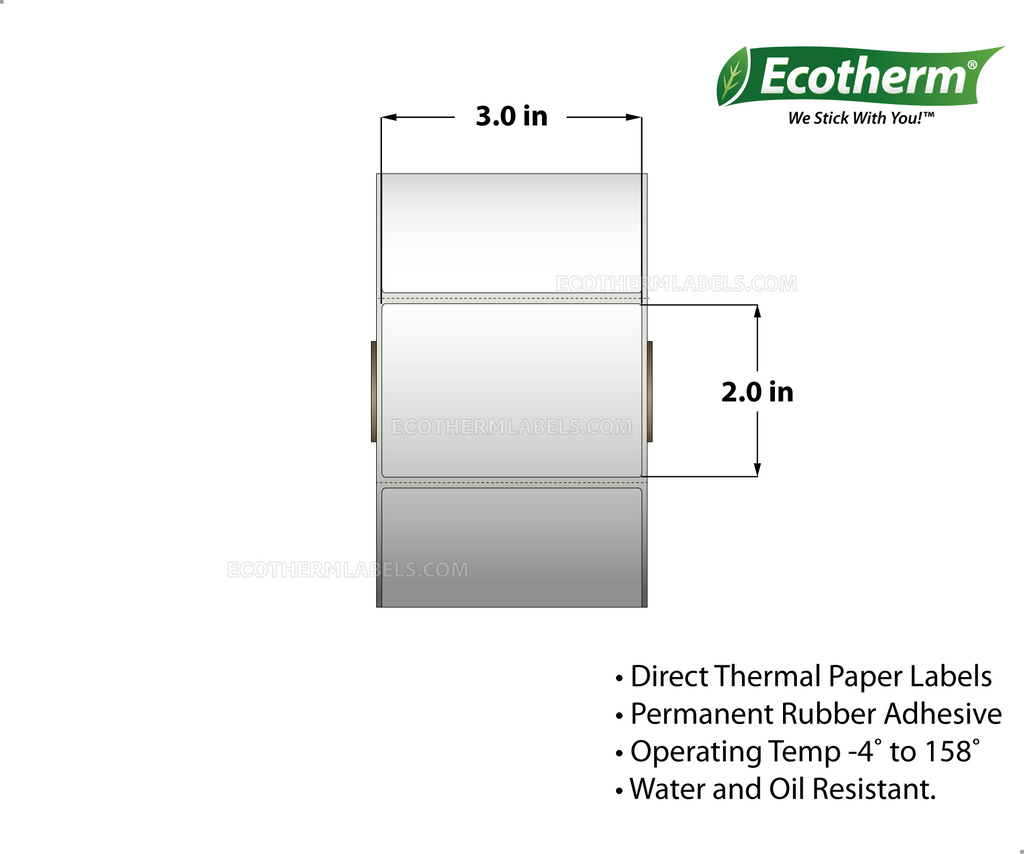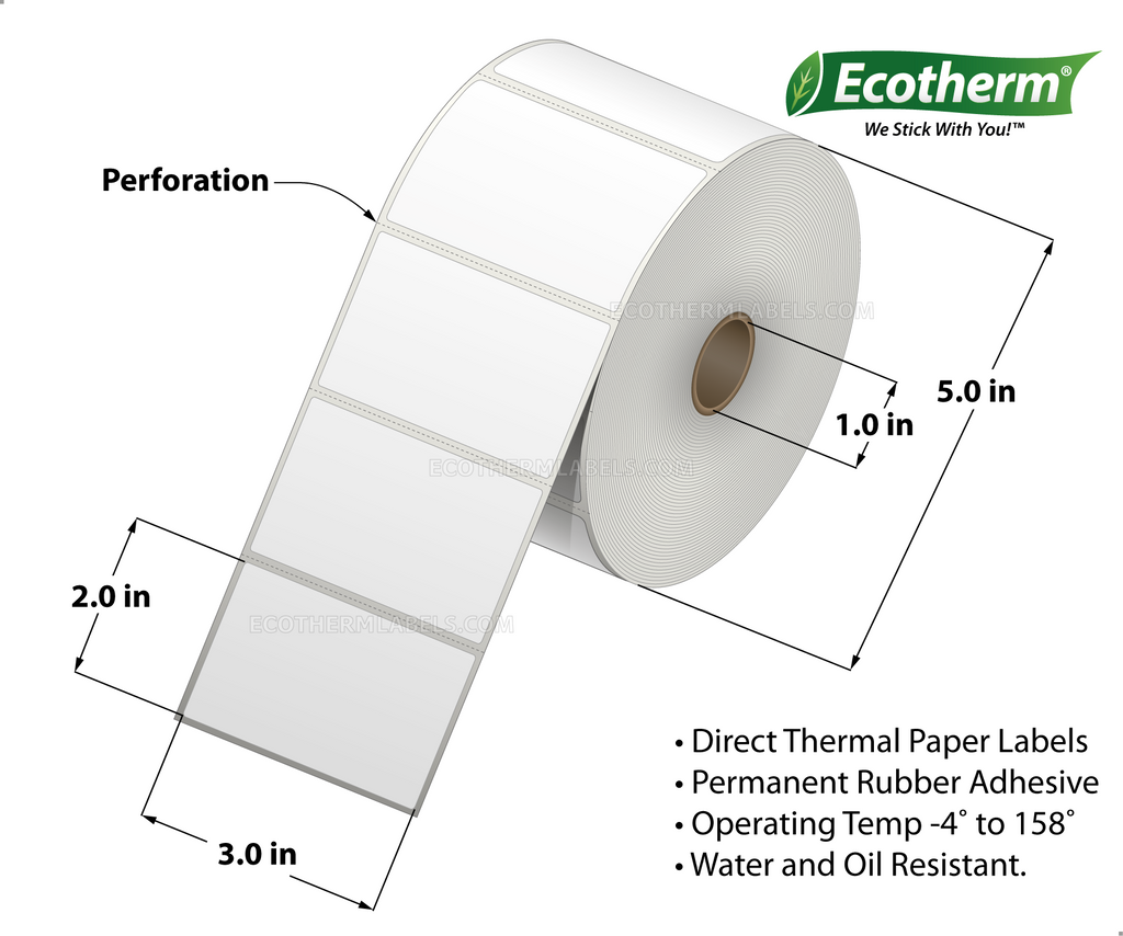 Label Size: 3.00 x 2.00 Inner Core Of Roll: 1" Core Rolls Print Method: Direct Thermal Color: White Material: Paper Perforations: Perforated Adhesive: Rubber Labels Across: 1 Labels Per Roll: 1,240 Rolls Per Case: 6 Labels Per Case: 7,440 Sold By: Sold By The Case
