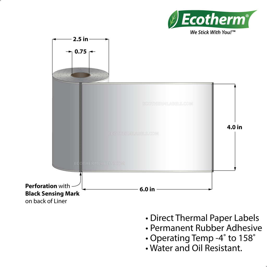 Label Size: 4.00 x 6.00 Inner Core Of Roll: 0.75" Core Rolls Print Method: Direct Thermal Color: White Material: Paper Perforations: Perforated Adhesive: Rubber Labels Across: 1 Labels Per Roll: 105 Rolls Per Case: 25 Labels Per Case: 2,625 Sold By: Sold By The Case
